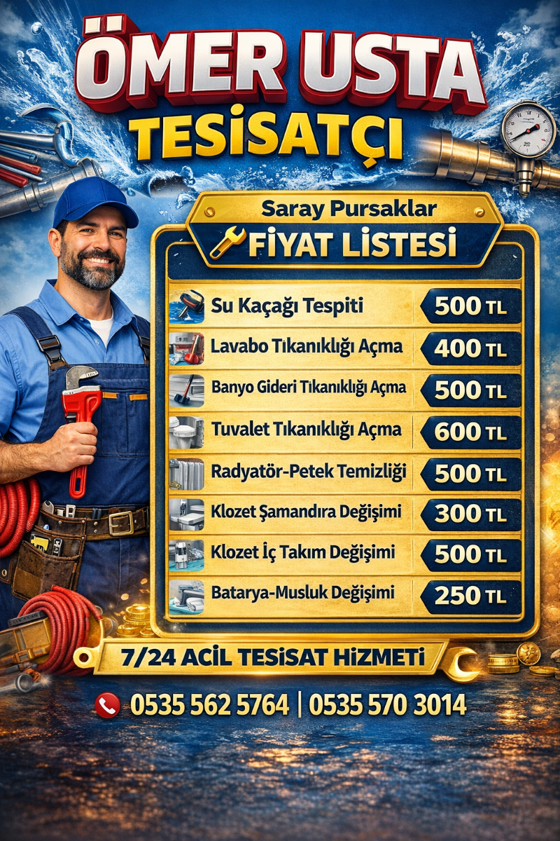 Pursaklar Saray bölgesinde hızlı servis, uygun fiyat ve garantili işçilik sunuyoruz. Ömer Usta ve ekibi, su kaçağı tespiti, tıkanıklık açma, sıhhi tesisat ve petek temizleme gibi tüm işlemlerde profesyonel destek sağlar.